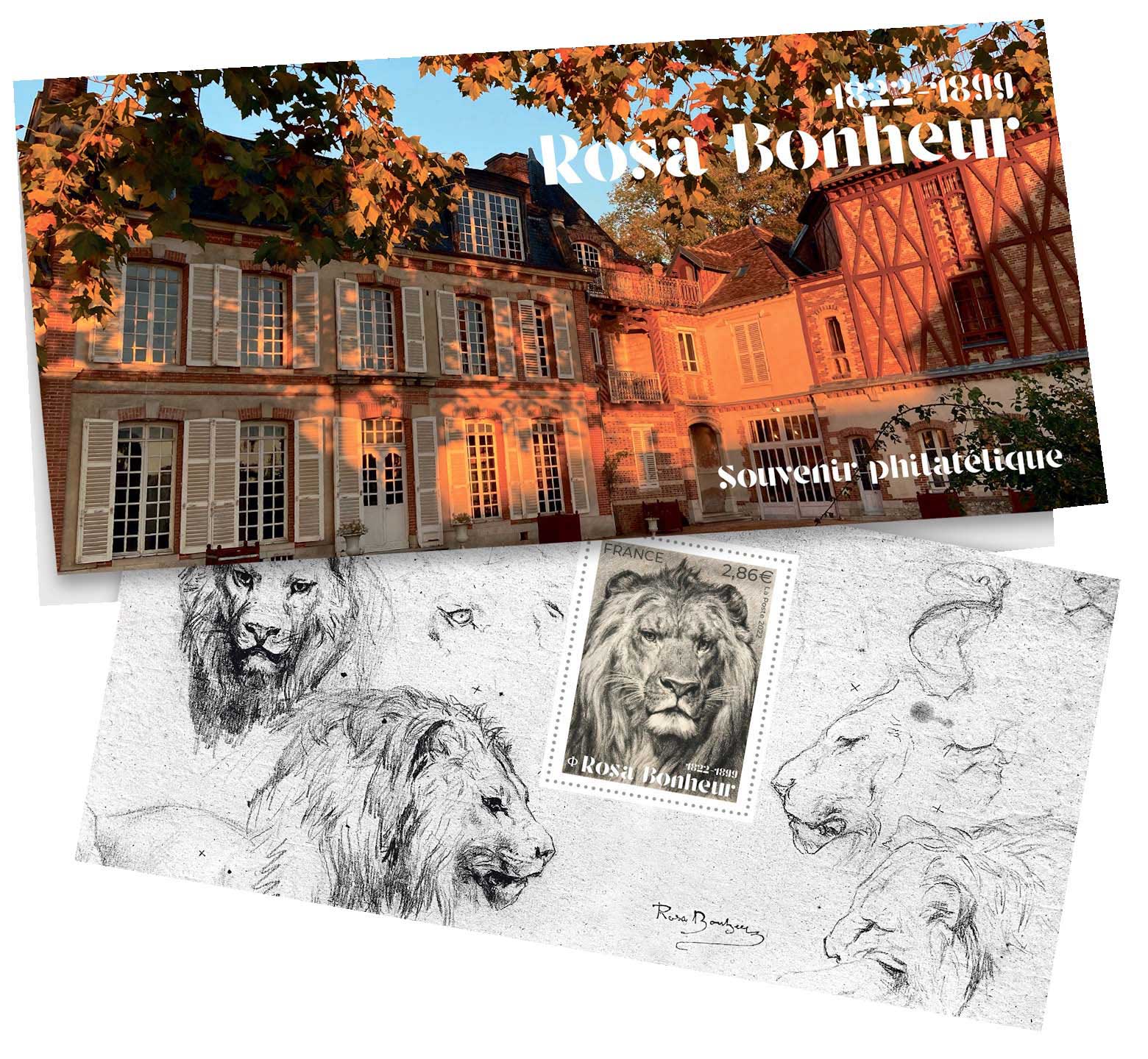 | Commentaire | Visuel - couverture : la cour du château de By, demeure de Rosa Bonheur de 1859 à 1899 - Feuillet : l'une de ses études graphiques sur ses lions, réalisées à la mine graphite.(H 43,5 x 29,8 cm) signées à l'encre. En savoir plus sur Wikipédia : Rosa Bonheur |