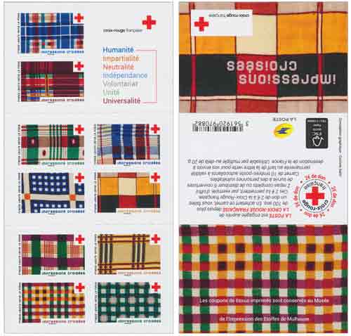 | Description | Émission d'un carnet de 10 timbres-poste illustrés par des étoffes en impressions croisées pour la Croix-Rouge française. |