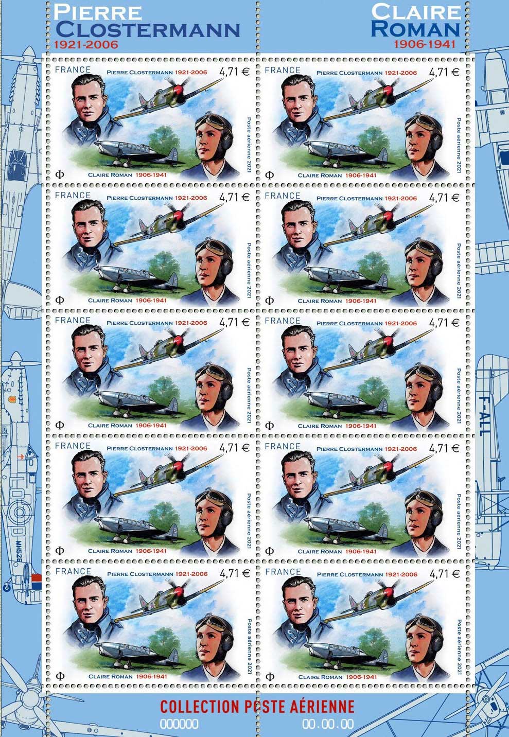 Visuel : Pierre CLOSTERMANN et son Hawker Tempest Mk V série 2 - NV724 - Immatriculation : JF-E "Le Grand Charles" à bord duquel il a terminé la guerre. + Claire ROMAN et le SFCA Maillet 21 (juil.1935 - numéro de la copie "F-AODA") avec lequel elle a participée à certaines courses aériennes. + sur les marges - côte gauche : le "Supermarine Spitfire LF IX-C" / type 361 /1943 - série : MH526 - Immatriculation : LO-D - utilisé par Pierre Clostermann sur la base aérienne de Ford (Sussex) au printemps 1944 (groupe de chasse 602 "City of Glasgow") et côté droit : à l'aéroclub Roland-Garros d'Orly (1933/34) Claire Roman apprend le pilotage sur "Caudron C.272 Luciole".
