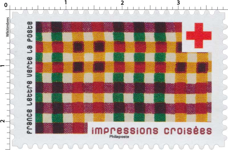 | Description | Provenant du carnet de 10 timbres-poste illustrés par des étoffes en impressions croisées pour la Croix-Rouge française. |