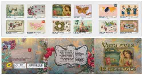 | Description | Émission d'un carnet de collection de 12 timbres-poste autocollants, illustré par 12 cartes postales anciennes, dites « fantaisie » pour fêter les 150 ans de la carte postale en France. |