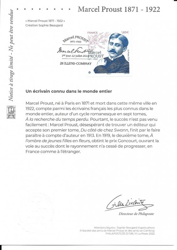 | Description | Émission d'un timbre à l’effigie de Marcel PROUST à l’occasion du centenaire de sa disparition. |