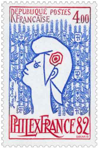 | Description | Philexfrance 1982. La Marianne de Jean Cocteau (1889-1963), artiste aux multiples talents, né à Maisons-Laffitte (Yvelines) |