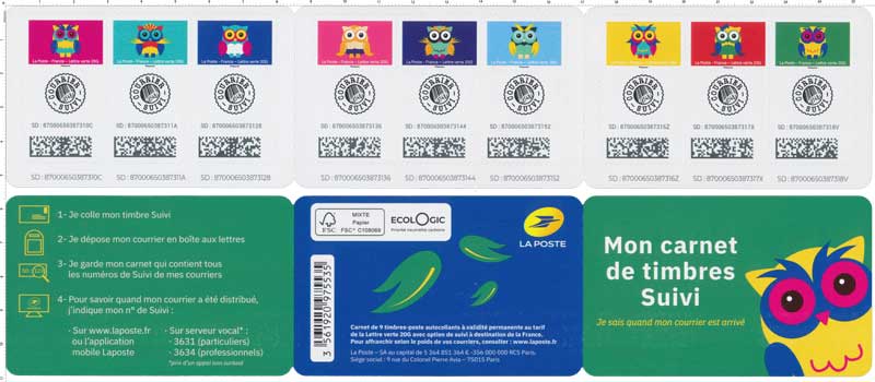 | Description | Émission d'un carnet de 9 timbres adhésifs incluant l’option Suivi. |