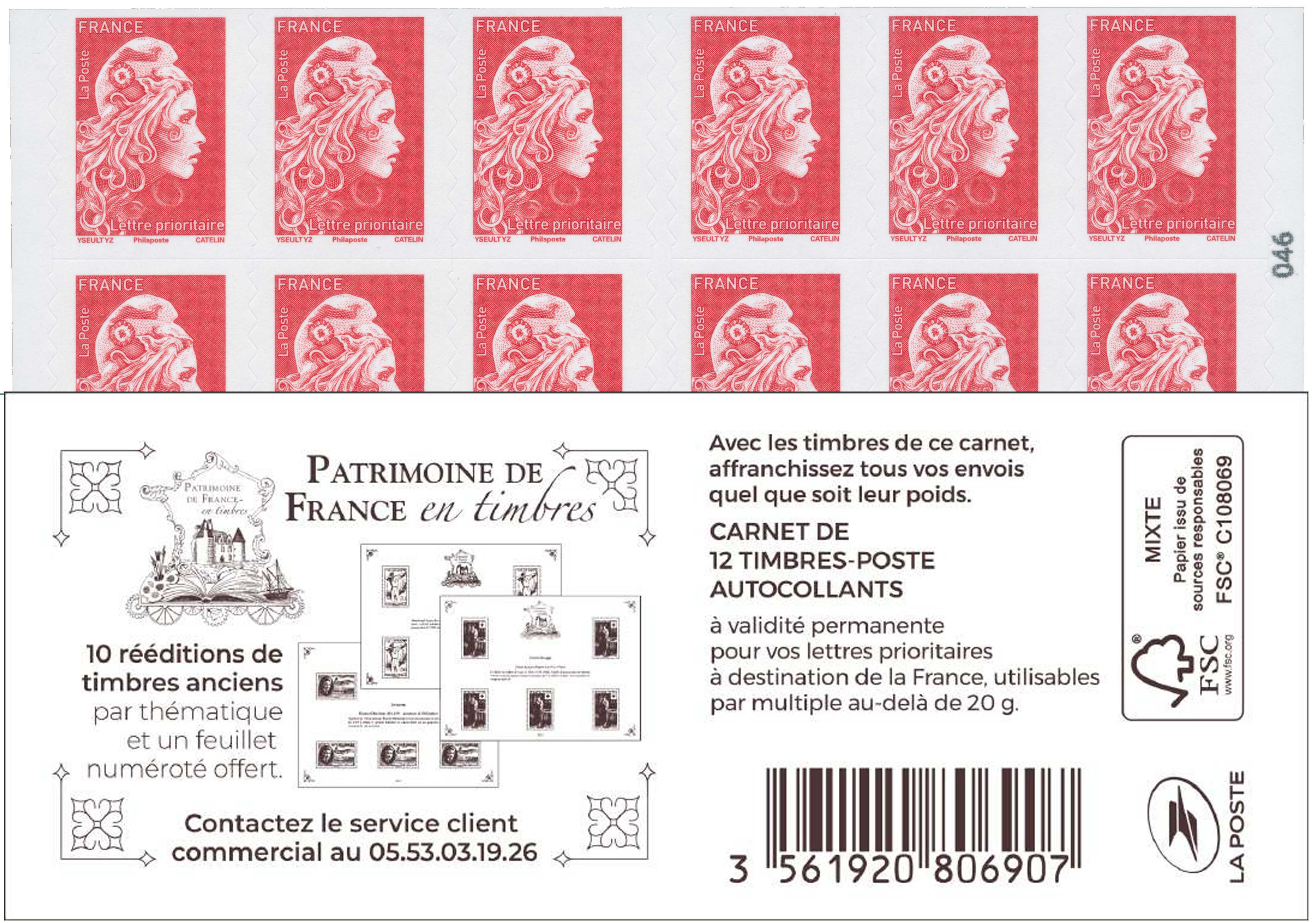 | Description | CARNET MARIANNE de 12 TP prioritaires "PATRIMOINE DE FRANCE EN TIMBRES" |