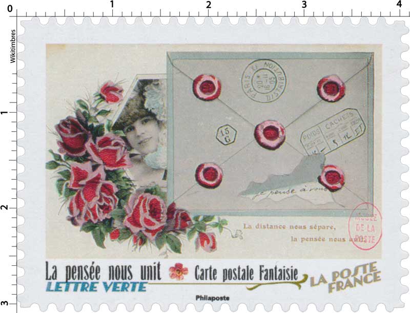 | Description | Provenant du carnet de collection de 12 timbres-poste autocollants, illustré par 12 cartes postales anciennes, dites « fantaisie » pour fêter les 150 ans de la carte postale en France. |
