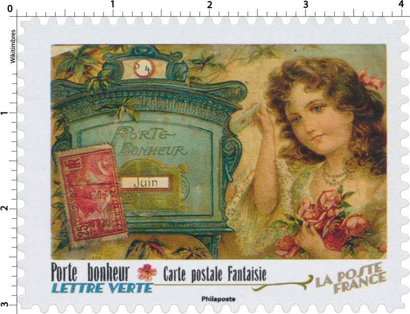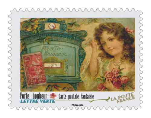 | Description | Provenant du carnet de collection de 12 timbres-poste autocollants, illustré par 12 cartes postales anciennes, dites « fantaisie » pour fêter les 150 ans de la carte postale en France. |