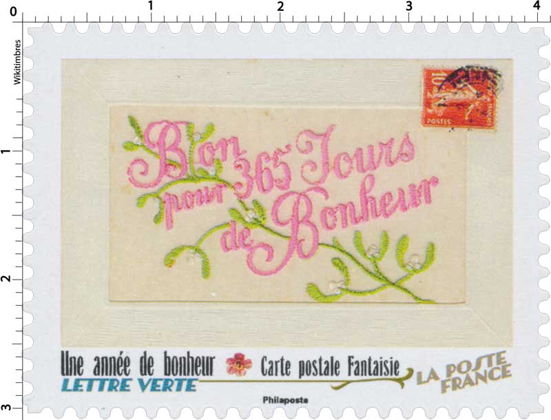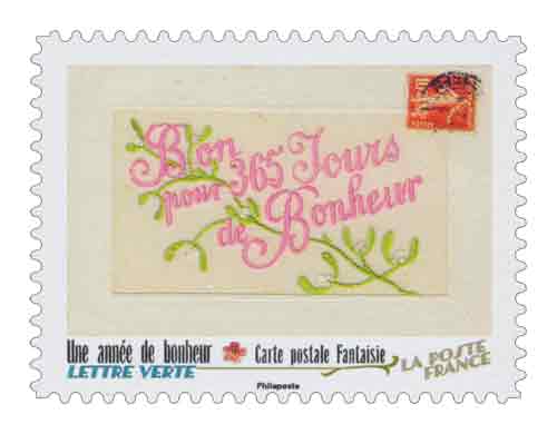 | Description | Provenant du carnet de collection de 12 timbres-poste autocollants, illustré par 12 cartes postales anciennes, dites « fantaisie » pour fêter les 150 ans de la carte postale en France. |