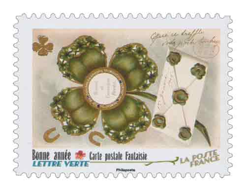 | Description | Provenant du carnet de collection de 12 timbres-poste autocollants, illustré par 12 cartes postales anciennes, dites « fantaisie » pour fêter les 150 ans de la carte postale en France. |