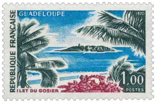 Émis en France en 1970, le timbre-poste consacré à l’îlet du Gosier s’inscrit dans la série dédiée aux sites et monuments des départements d’outre-mer, illustrant la volonté de l’administration postale de mettre en valeur des territoires éloignés de la métropole mais pleinement intégrés à l’espace national depuis la départementalisation de 1946 ; gravé et imprimé en taille-douce, ce timbre gommé de 1,00 franc correspond à un tarif spécifique de l’époque et se distingue par une polychromie évoquant la mer, la végétation et les reliefs côtiers, éléments constitutifs de l’identité paysagère guadeloupéenne ; le choix de l’îlet du Gosier, petit îlot corallien situé au large de la Grande-Terre à proximité de Pointe-à-Pitre, renvoie à l’essor touristique que connaît alors l’archipel, dans un contexte où la Guadeloupe cherche à diversifier une économie historiquement fondée sur l’agriculture et la production sucrière ; l’image proposée par le timbre associe dimension naturelle et projection économique, en suggérant à la fois la douceur du climat, la richesse des paysages littoraux et la vocation maritime et aérienne de la région, point de passage stratégique dans la Caraïbe ; par cette émission de 1970, la philatélie française accompagne ainsi un discours institutionnel valorisant les potentialités touristiques et le rôle de carrefour international de l’archipel, tout en offrant une représentation apaisée et attractive de la vie ultramarine ; l’îlet du Gosier, alors déjà emblématique pour sa proximité avec les zones urbaines et portuaires, est aussi reconnu pour son phare, repère maritime durablement associé à l’histoire locale, élément discret mais symbolique d’un territoire tourné vers la mer et les échanges. |