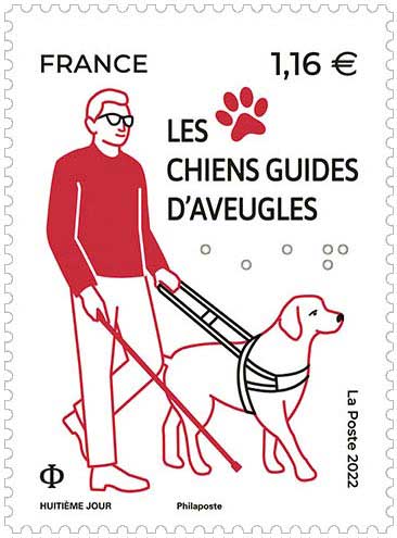 | Commentaire | Visuel : une personne malvoyante et son chien guide. Emprunte de chien + valeur faciale imprimée en braille. Un chien guide d’aveugle est un chien destiné à guider une personne souffrant de cécité ou de malvoyance profonde. Remis gratuitement à son bénéficiaire, il lui apporte plus d’autonomie, de confort et de sécurité dans ses déplacements de la vie quotidienne. Son éducation rigoureuse lui permet d’accompagner son maître dans tous ses déplacements et d’assurer son trajet en l’aidant à s’orienter et à éviter tout danger. Il est également un compagnon au quotidien et un véritable vecteur de lien social. En savoir plus sur Wikipédia:Chien guide d'aveugle |