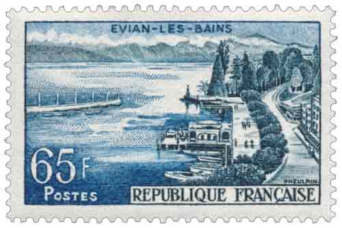 | Commentaire | Émis en octobre 1957 dans la série touristique d’usage courant, le timbre consacré à Évian-les-Bains met en avant une grande station thermale française située sur la rive sud du Lac Léman, au pied du Chablais. La composition, gravée en taille-douce, associe le paysage lacustre et le cadre urbain d’Évian, soulignant la double identité de la ville : lieu de cure et de villégiature, mais aussi pôle touristique international déjà solidement installé au milieu du XXᵉ siècle. Depuis la fin du XIXᵉ siècle, la renommée d’Évian repose sur l’exploitation de ses eaux minérales, qui a façonné l’économie locale et l’architecture de la station, marquée par les hôtels, établissements thermaux et promenades en bord de lac. Le choix d’Évian dans cette série de 1957 s’inscrit dans une politique postale visant à promouvoir les paysages et sites emblématiques du territoire, à un moment où le tourisme intérieur et international connaît une forte expansion. Par son tirage élevé et son usage postal fréquent, ce timbre a largement diffusé l’image d’Évian-les-Bains comme symbole du thermalisme français et des loisirs alpins. |