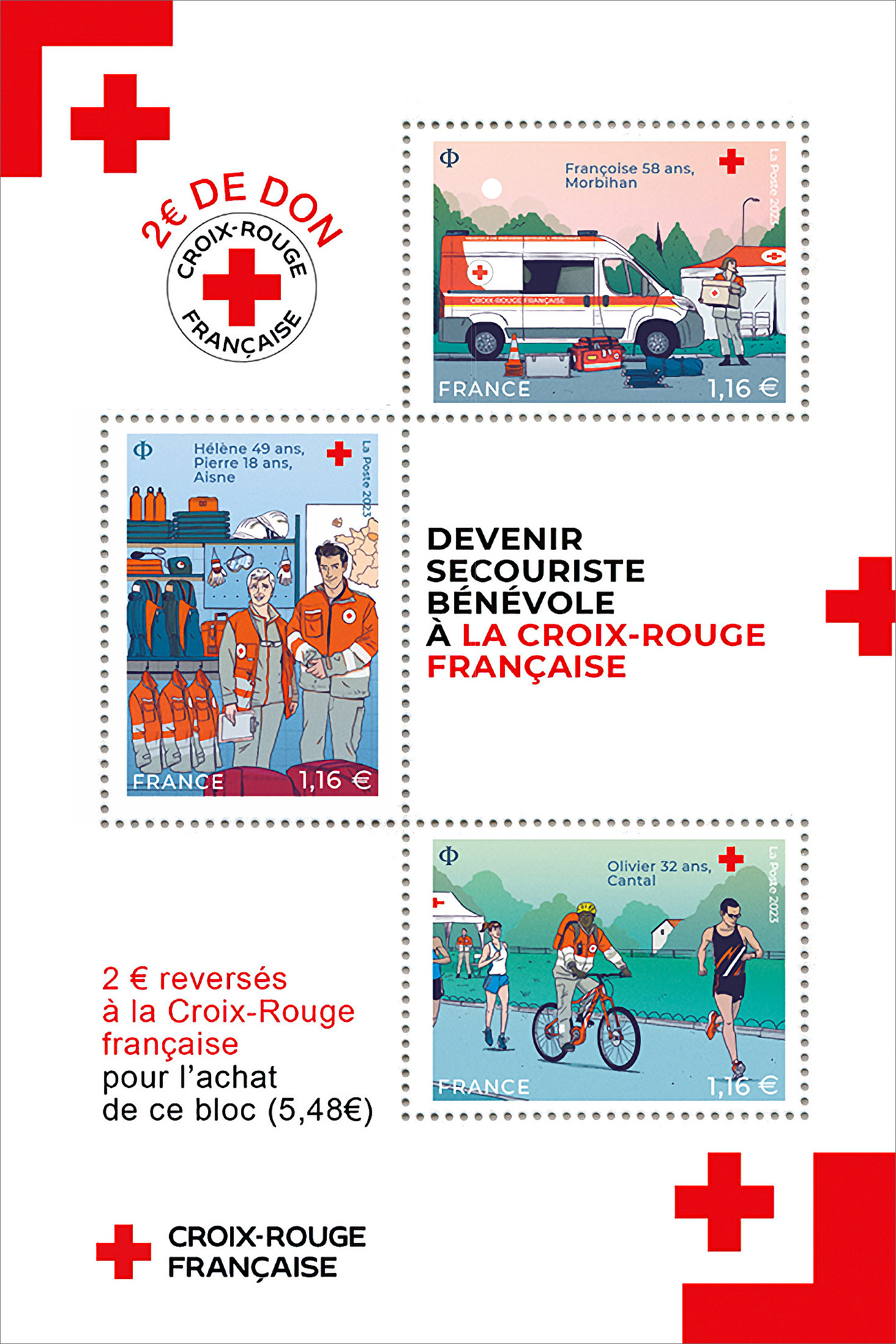 | Commentaire | La Poste reverse deux euros de don à la Croix-Rouge française, pour chaque bloc vendu. La Croix-Rouge française agit pour protéger et relever sans condition les personnes en situation de vulnérabilité et construire, avec elles, leur résilience. Face à la multiplication et à la diversifi-cation des crises, face à l’incertitude, nous sommes tous vulnérables. Nous devons ainsi apprendre à mieux anticiper et nous préparer ensemble, mais aussi nous adapter pour mieux rebondir face aux difficultés. L’entraide et le lien social sont cruciaux pour agir et développer la résilience des individus et des populations. Pour cela, le secourisme à la C.R.F. est une nécessité pour couvrir la totalité des départements du territoire.