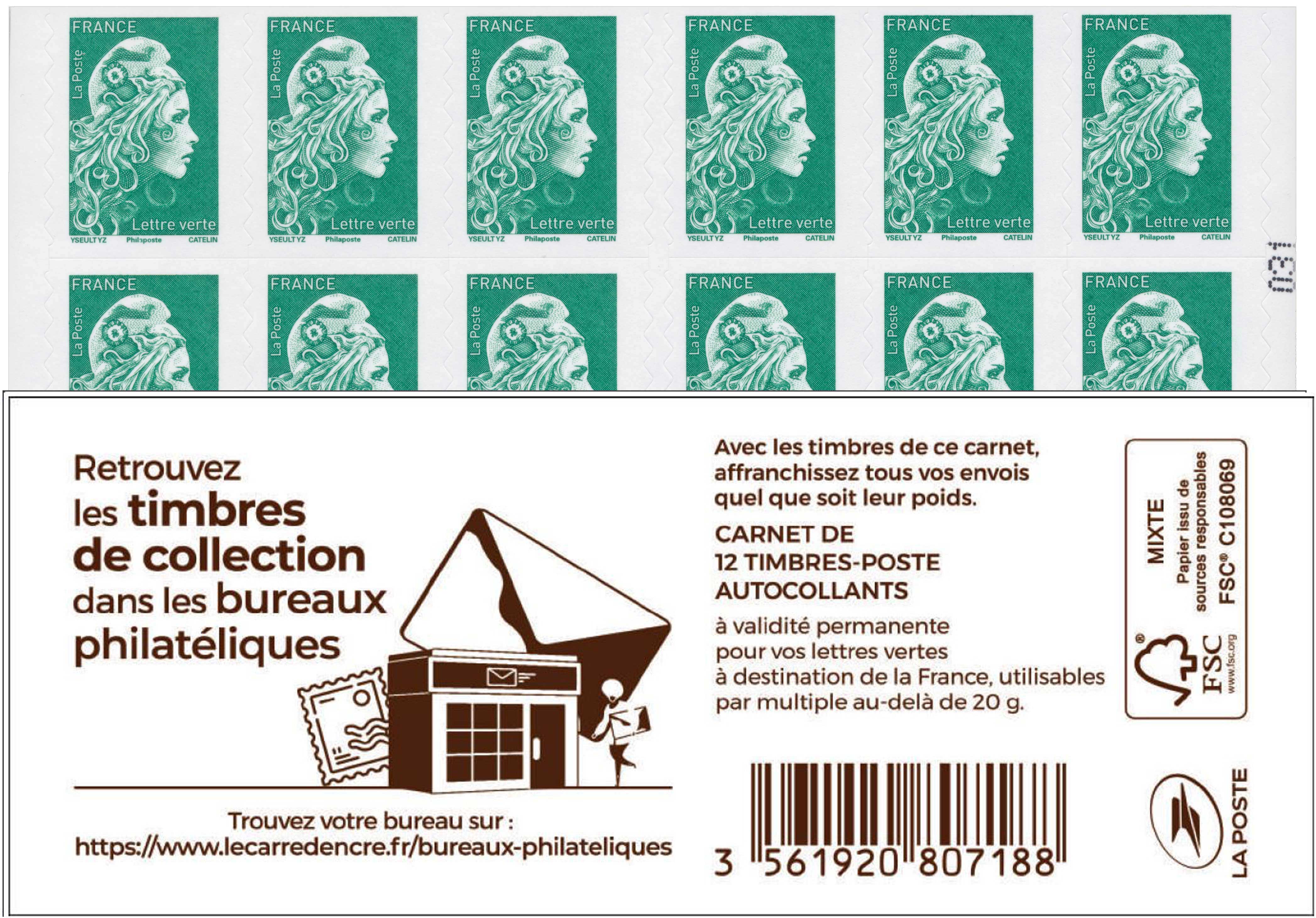 | Description | CARNET MARIANNE de 12 timbres lettre verte "BUREAUX PHILATÉLIQUES" |