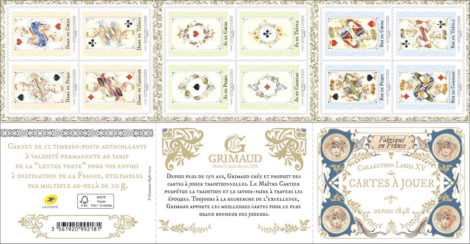 | Description | Émission d'un carnet de collection de 12 timbres-poste autocollants, illustré de 12 cartes à jouer du jeu de whist, collection Louis XV de la maison Grimaud. |