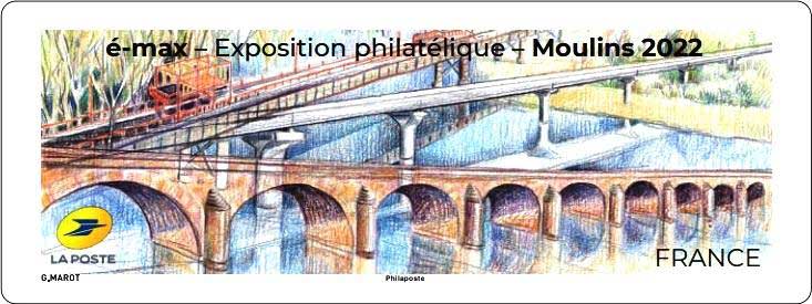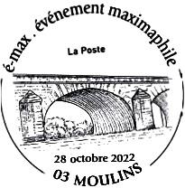 | Commentaire | Visuel : Trois ouvrages de génie civil, ou l'art dans les ponts à Moulins : le premier, franchissant la rivière Allier avec ses arches maçonnées en pierre, est le pont routier Régemortes (Long..302 m - portée principale 19,50 m), mis en service en 1763 et réalisé par l'ingénieur Louis Règemortes (v.1709-avril 1774) / le deuxième, le Nouveau pont routier (Long..455 m - larg. 12,90 m - 10 piles de 1 à 4 m de largeur - avec 3 zones : véhicules motorisés + pistes cyclables + trottoirs piétonniers) complémentaire au pont Régemortes, pour un franchissement aval de l'Allier, une nécessité en vue d'absorber l'accroissement du trafic Est-Ouest de l'agglomération de Moulins (travaux de 2021 à fin 2023). / le Pont de Fer (ou Pont noir), ancien pont ferroviaire à poutres (fer + piles en fonte et en béton), franchissant l'Allier, édifié de 1857 à nov.1859 (long. 316,5 m, avec 9 travées) - concepteurs : Basile Parent (1807-1866, ingénieur belge) et Pierre Schaken (1793-1870, ingénieur franco-belge) - c'est l'un des premiers ponts métalliques en France, l'usage ferroviaire ayant cessé depuis 2015, il a été aménagé de 2019 à 2021 en pont cycliste et piétonnier, dans le cadre d'une vois verte ; Il bénéficie de l'installation de trois belvédères vitrés sur le pont, ainsi que d'un éclairage à leds et d'accès végétalisés aux deux extrémités. - Timbre à Date : détail du pont Régemortes.