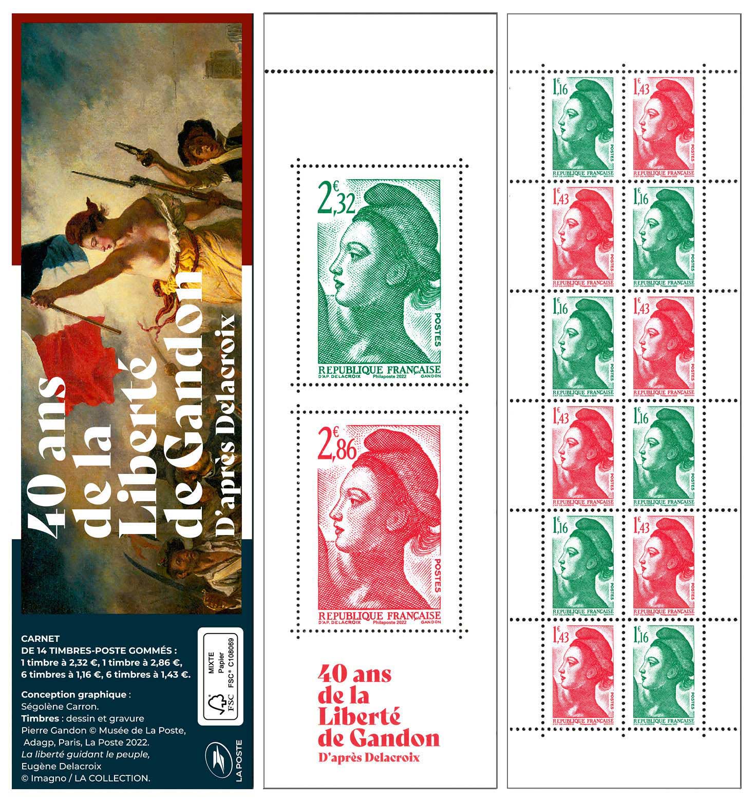 | Description | Émission d'un carnet de 14 timbres « 40 ans de la Liberté de Gandon », d’après Delacroix est constitué d'une couverture et de 2 feuillets (1 feuillet de 2 timbres et 1 feuillet de 12 timbres). |
