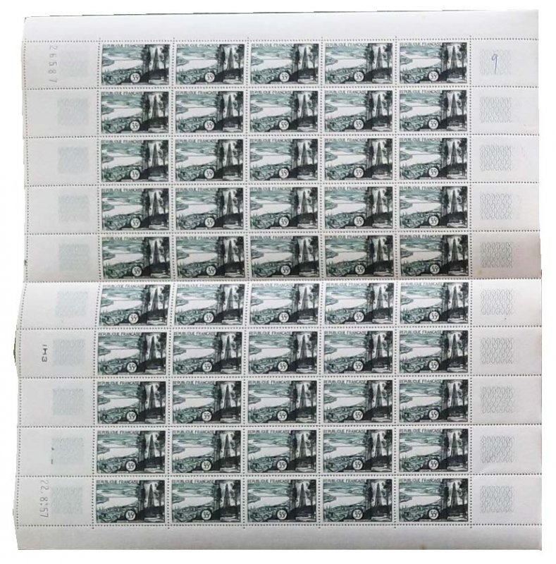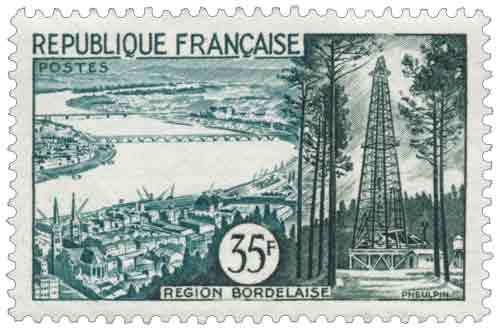 | Commentaire | Émis en 1957 par la France, le timbre-poste touristique consacré à la Région bordelaise s’inscrit dans la continuité directe de la série courante de 1955 dédiée aux paysages et sites emblématiques, dont il constitue une reprise adaptée au changement des tarifs postaux intervenu au 1ᵉʳ juillet 1957, avec une nouvelle valeur faciale et une gamme chromatique modifiée ; mis en vente à partir du 19 juillet 1957, imprimé en taille-douce rotative au format horizontal, il illustre de manière synthétique l’identité économique et géographique de la région en associant, à gauche, une vue aérienne de Bordeaux et de ses quais à l’époque où la ville demeurait un grand port de commerce fluvial, identifiable notamment par l’église Saint-Louis des Chartrons et les infrastructures portuaires antérieures à la multiplication des ponts sur la Garonne, et, à droite, un paysage landais ponctué de pins entourant une tour de forage pétrolier à Parentis-en-Born, symbole de l’« or noir » exploité depuis 1954 dans les Landes ; par cette composition, le timbre met en regard l’héritage commercial et urbain de Bordeaux et l’essor industriel moderne du Sud-Ouest, offrant un témoignage philatélique cohérent de la mutation économique régionale au milieu des années 1950, dans un esprit conforme aux émissions touristiques et régionales de la période.