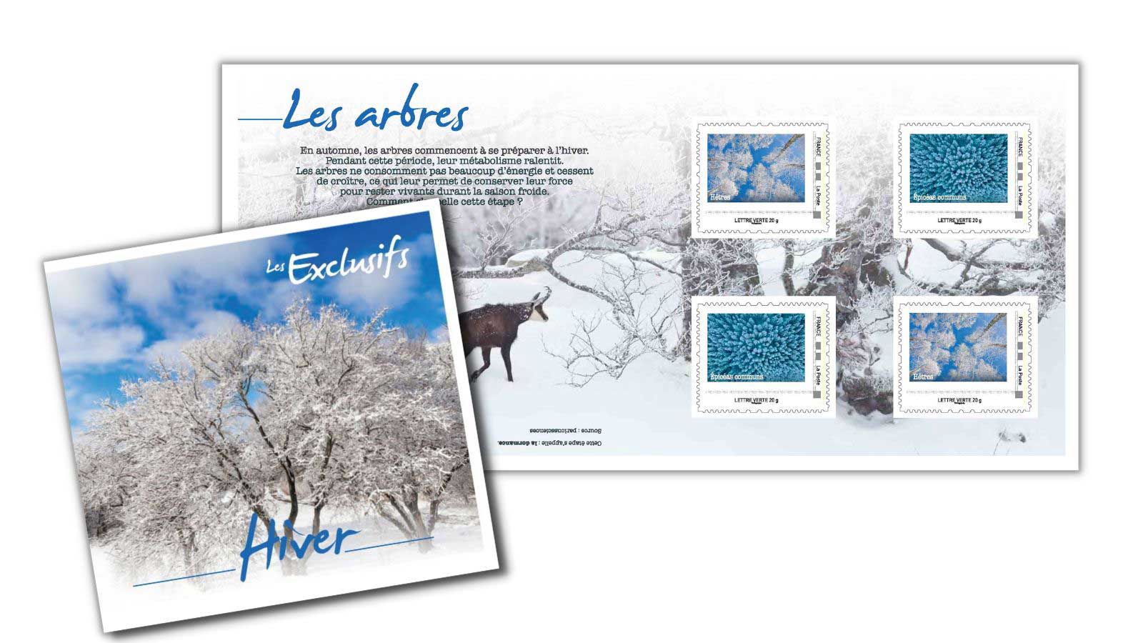 | Commentaire | Emission d'un collector de la série "les Exclusifs", sur le thème des arbres sous la neige. L'année 2023 verra le lancement d’une nouvelle série de collectors saisonniers consacrés aux Arbres. Ce collector, "Hiver", sur fond de paysage neigeux, contient des timbres-poste dont les espèces retenues sont : le hêtre et l’épicéa commun |