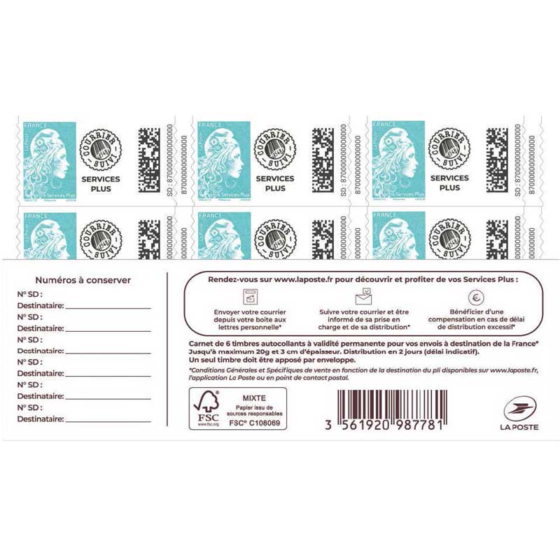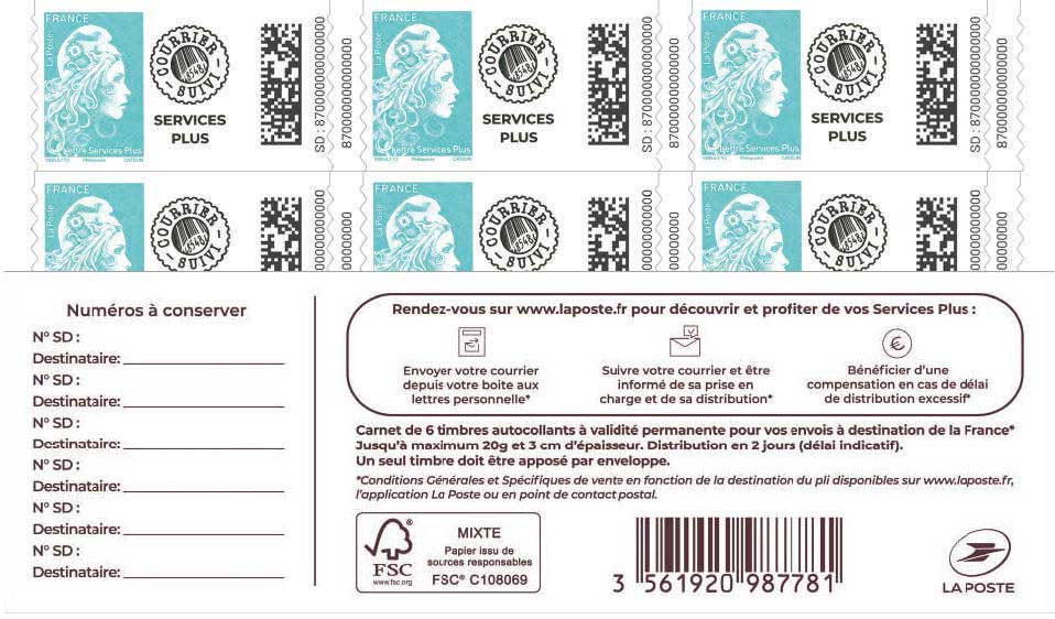 | Description | Émission d'un carnet de 6 timbres adhésifs avec suivi inclus |