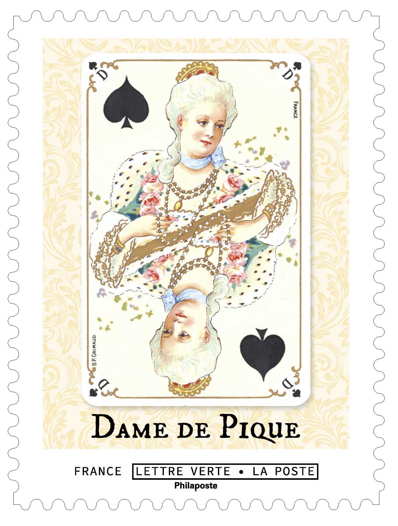 | Description | Provenant du carnet de collection de 12 timbres-poste autocollants, illustré de 12 cartes à jouer du jeu de whist, collection Louis XV de la maison Grimaud. |
