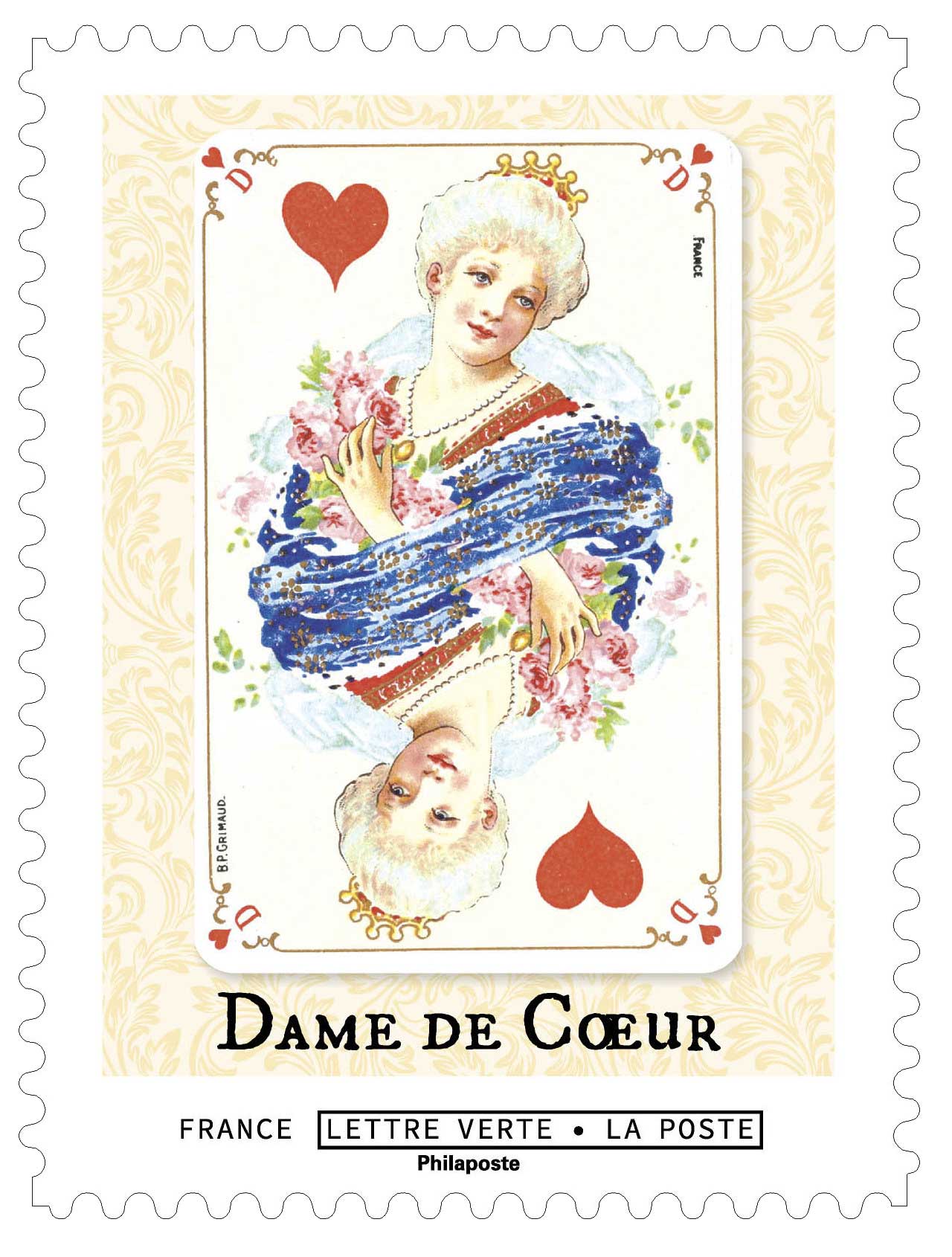 | Description | Provenant du carnet de collection de 12 timbres-poste autocollants, illustré de 12 cartes à jouer du jeu de whist, collection Louis XV de la maison Grimaud. |