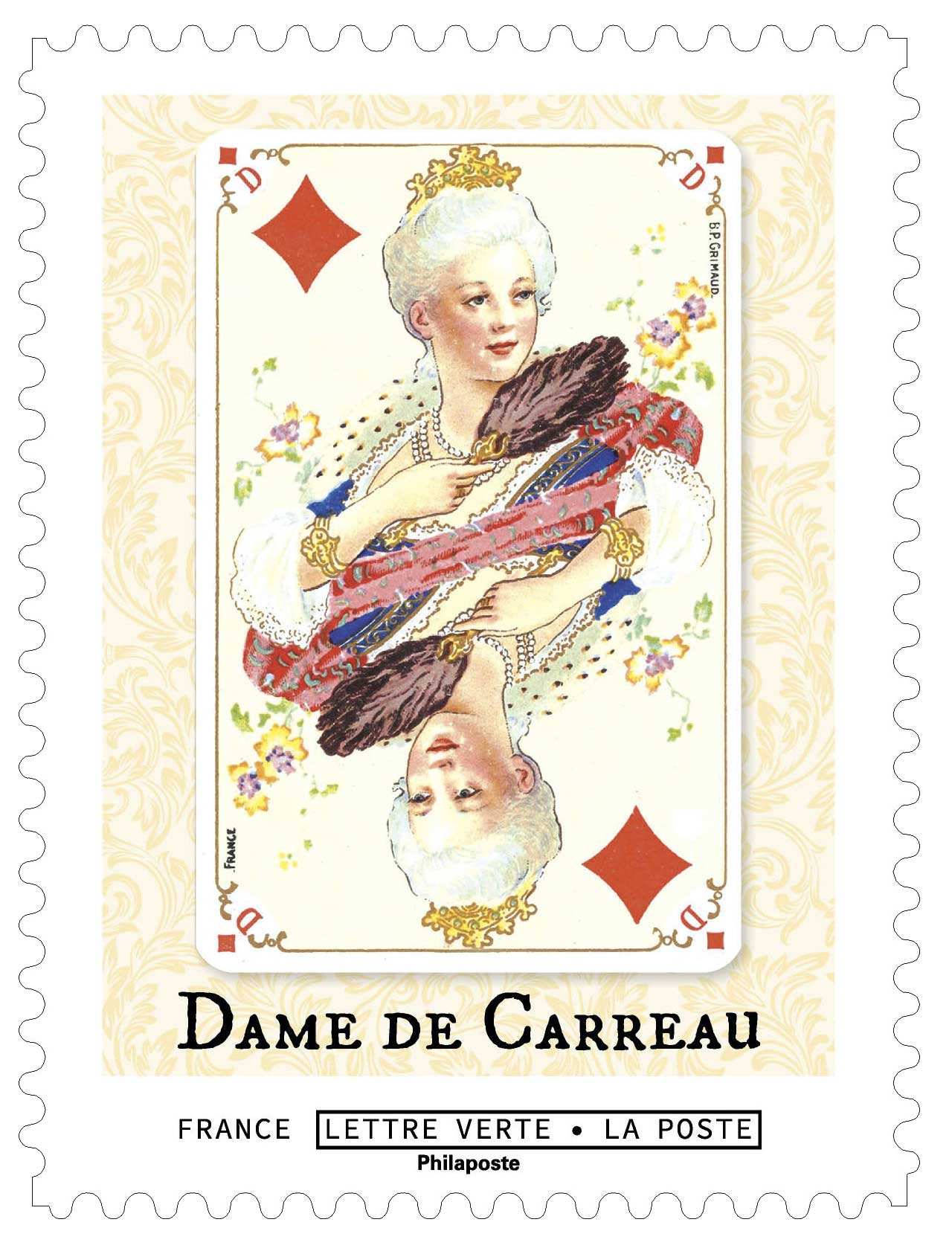 | Description | Provenant du carnet de collection de 12 timbres-poste autocollants, illustré de 12 cartes à jouer du jeu de whist, collection Louis XV de la maison Grimaud. |
