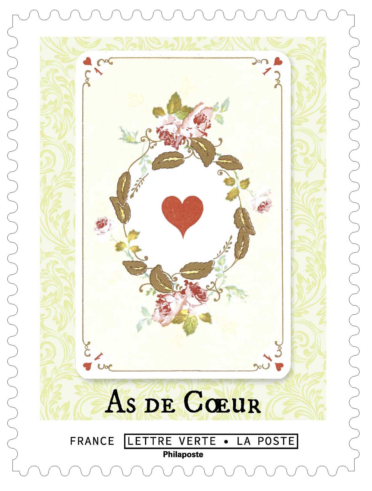 | Description | Provenant du carnet de collection de 12 timbres-poste autocollants, illustré de 12 cartes à jouer du jeu de whist, collection Louis XV de la maison Grimaud. |