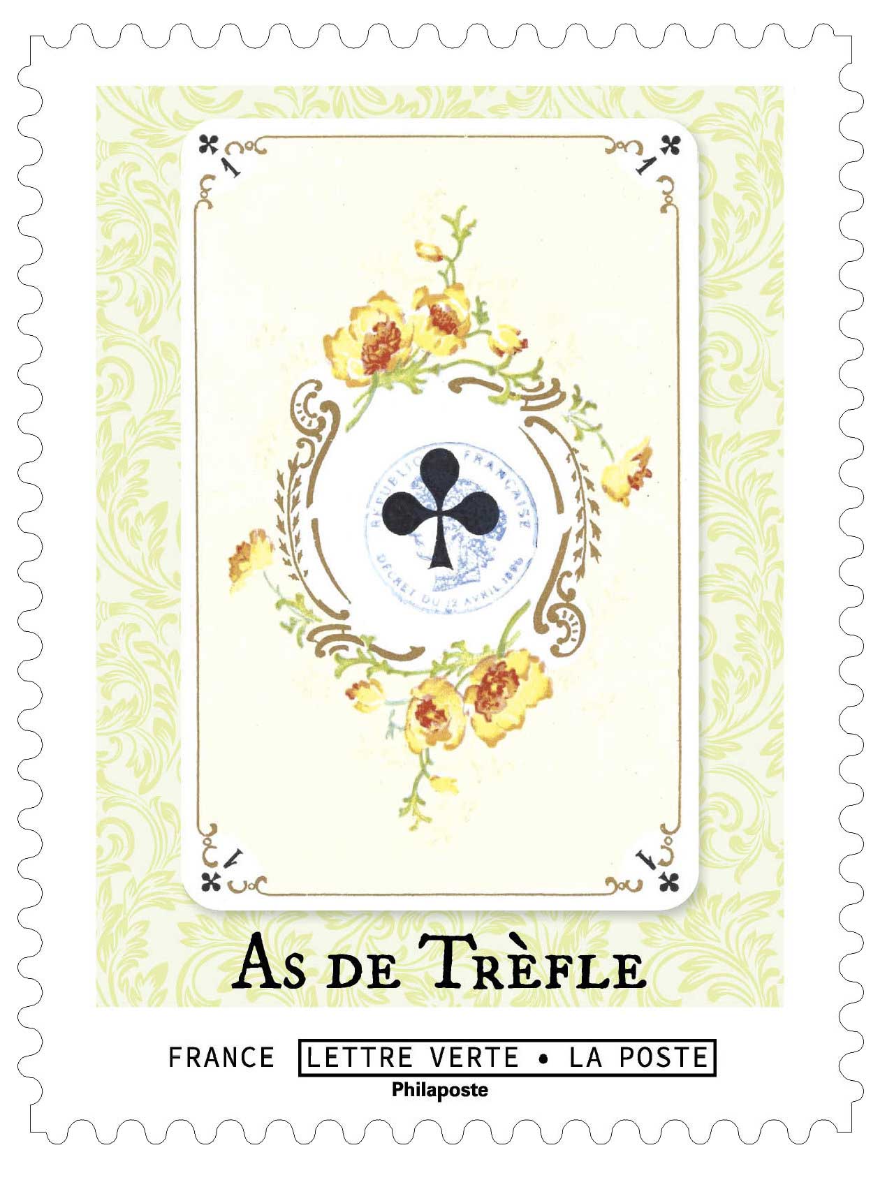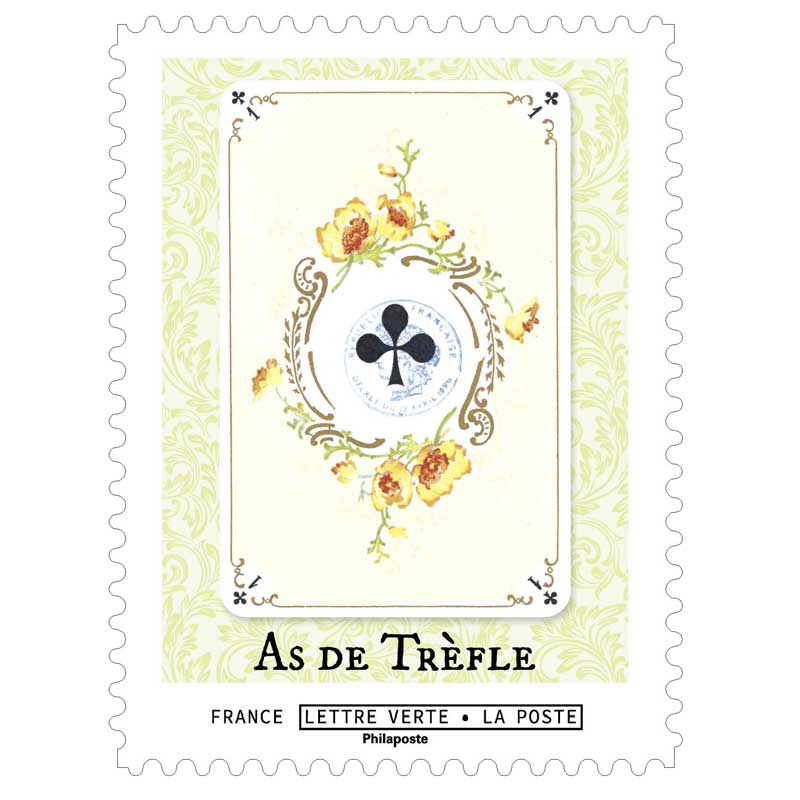 | Description | Provenant du carnet de collection de 12 timbres-poste autocollants, illustré de 12 cartes à jouer du jeu de whist, collection Louis XV de la maison Grimaud. |