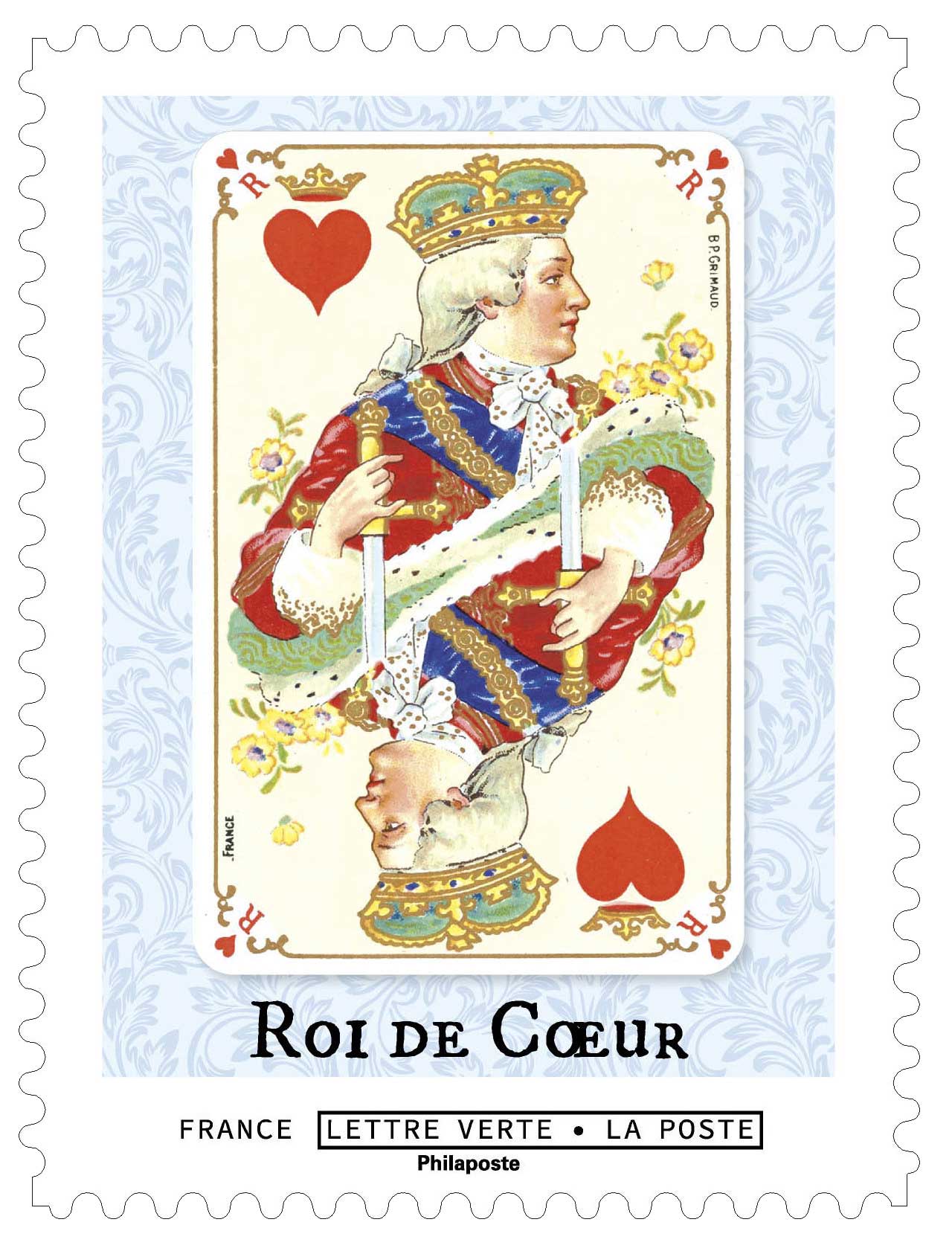 | Description | Provenant du carnet de collection de 12 timbres-poste autocollants, illustré de 12 cartes à jouer du jeu de whist, collection Louis XV de la maison Grimaud. |