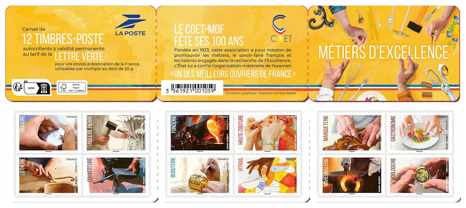 | Description | Émission d'un carnet de timbres-poste illustré par douze métiers d’excellence à l’occasion des 100 ans du COET-MOF. |