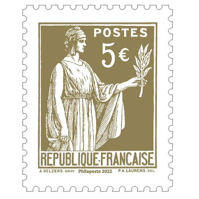 Bloc spécial, à tirage limité, mettant à l’honneur le 90ème anniversaire de l'émission du timbre type "Paix" (1èresérie). Il est imprimé selon le procédé de typographie rotative utilisé en 1932, se compose de 6 timbres de couleurs "olive" et "bleu". Historique : André Tardieu (1876-1945, homme d'Etat) président du Conseil des ministres, demande en 1932 à l'administration postale de réaliser une nouvelle série de timbres d'usage courant consacrés à la "Paix". La création artistique est confiée à Paul-Albert LAURENS (18 janv.1870 - 27 sept.1934, peintre, graveur, illustrateur et enseignant à polytechnique de 1919 à 1934) qui réalise une "Allégorie de la République, coiffée du bonnet phrygien, tenant à gauche un rameau d'olivier et à droite, maintenant son épée au fourreau". La gravure est confiée à Jean Antonin DELZERS (17 août 1873-8 nov.1943, dessinateur et graveur).