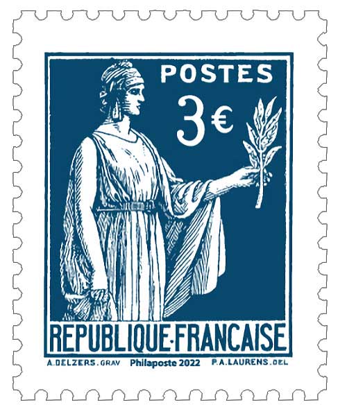 Bloc spécial, à tirage limité, mettant à l’honneur le 90ème anniversaire de l'émission du timbre type "Paix" (1èresérie). Il est imprimé selon le procédé de typographie rotative utilisé en 1932, se compose de 6 timbres de couleurs "olive" et "bleu". Historique : André Tardieu (1876-1945, homme d'Etat) président du Conseil des ministres, demande en 1932 à l'administration postale de réaliser une nouvelle série de timbres d'usage courant consacrés à la "Paix". La création artistique est confiée à Paul-Albert LAURENS (18 janv.1870 - 27 sept.1934, peintre, graveur, illustrateur et enseignant à polytechnique de 1919 à 1934) qui réalise une "Allégorie de la République, coiffée du bonnet phrygien, tenant à gauche un rameau d'olivier et à droite, maintenant son épée au fourreau". La gravure est confiée à Jean Antonin DELZERS (17 août 1873-8 nov.1943, dessinateur et graveur).