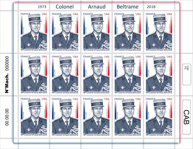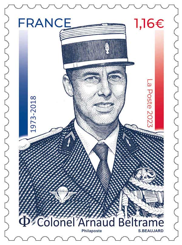 | Description | Émission d'un timbre à l’effigie du Colonel de gendarmerie Arnaud BELTRAME, « tombé en héros » en mars 2018, après s’être échangé avec un otage lors d’une attaque terroriste. |