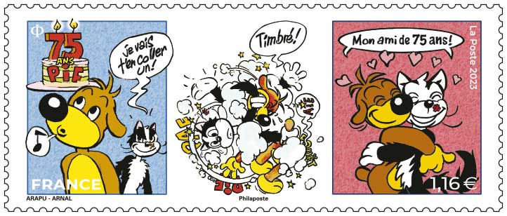 | Description | Émission du premier timbre Strip de France et il est à l’effigie de Pif le chien, le plus célèbre chien de la BD française, pour célébrer les 75 ans de sa naissance. |