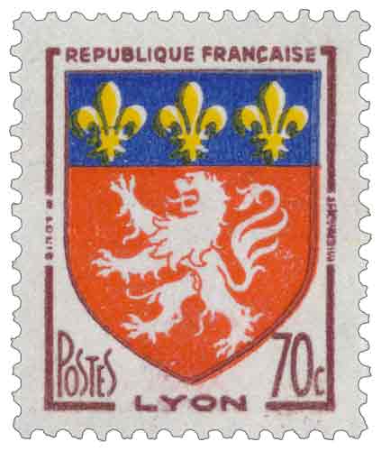 | Commentaire | Le timbre gommé émis en France en 1958 consacré aux armoiries de Lyon s’inscrit dans la troisième série des Armoiries des villes de France, programme philatélique destiné à mettre en valeur l’héraldique municipale à travers une iconographie officielle et normalisée. Mis en vente à partir du 17 novembre 1958 après un premier jour organisé à Lyon, ce timbre vertical de 70 centimes répond à un usage postal précis, l’affranchissement des journaux, ce qui explique un tirage élevé et une large diffusion sur le territoire. Le motif reprend fidèlement le blason lyonnais fixé dans sa forme actuelle en 1859, composé d’un lion d’argent sur champ de gueules surmonté d’un chef d’azur chargé de trois fleurs de lys d’or, rappelant à la fois le statut de capitale des Gaules et l’intégration durable de la ville dans l’histoire royale puis nationale française. Dessiné par Robert Louis et gravé par Jean Miermont, le timbre est imprimé en typographie rotative, technique caractéristique des séries courantes et semi-courantes de cette période, privilégiée pour sa rapidité et son rendement industriel. Par sa place dans la série, il participe à une représentation cohérente des grandes villes françaises à travers leurs armoiries, offrant une lecture à la fois postale, historique et symbolique du territoire, tout en illustrant la permanence des codes héraldiques dans la philatélie française de l’après-guerre. |
