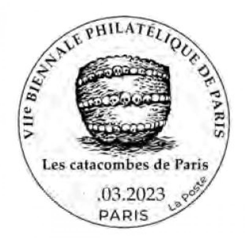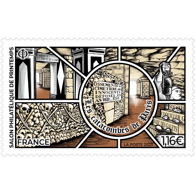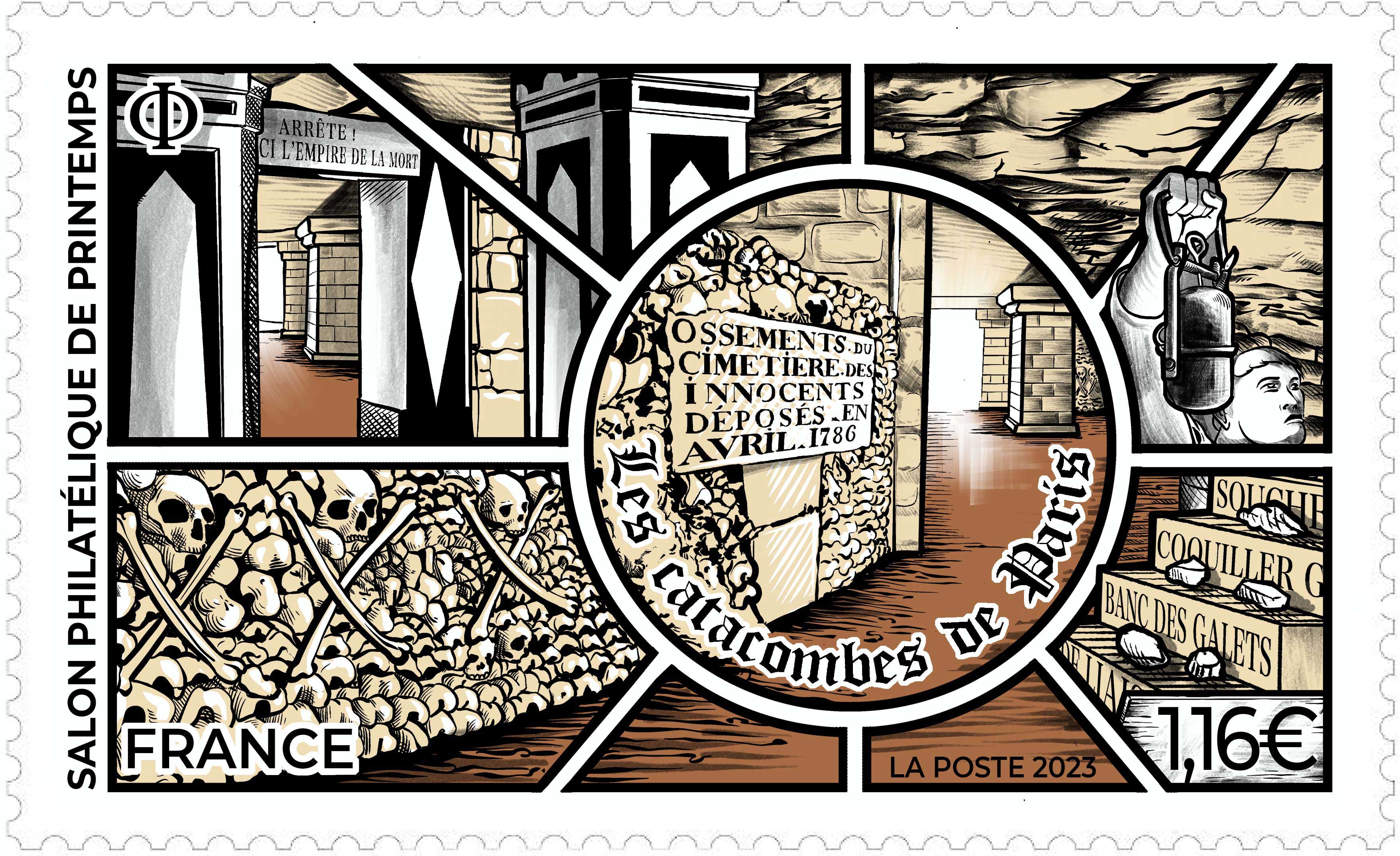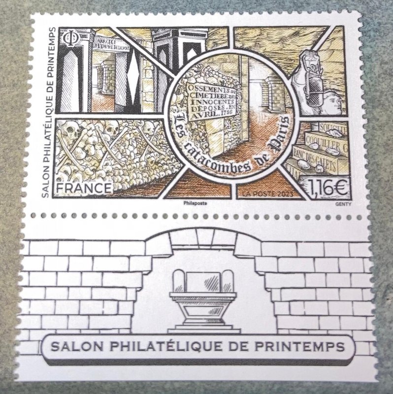 | Description | Émission d'un timbre dédié au Salon Philatélique de Printemps, illustré par les catacombes de Paris |