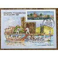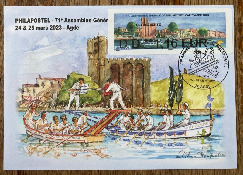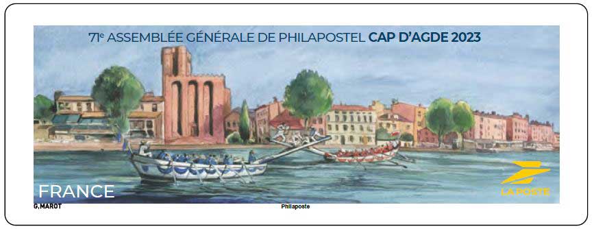 | Commentaire | Emission de 6000 packs de 2 vignettes (Lettre Verte et Lettre Prioritaire Internationale) La ville d'Agde possède un patrimoine naturel remarquable avec 4 sites "Natura 2000", 5 espaces protégés et 7 zones naturelles d'intérêt écologique, faunistique et floristique. Agde est parfois surnommée "la perle noire de la Méditerranée", ses monuments ayant été édifiés en pierre basaltique, bénéficie d'une histoire remontant au Xe siècle av. J.-C. Du début du Ve siècle, jusqu'à la Révolution, la cité est le siège d'un évêché pour le pouvoir temporel, mais elle est administrée par des consuls. C'est une ville portuaire depuis l'antiquité, favorisée vers la fin du XVIIe siècle par l'ouverture du "canal royal de Languedoc", rebaptisé "canal du Midi" à la Révolution de 1789 ; depuis les années 1970-1980, elle devient une station touristique et balnéaire, avec son important port de plaisance méditerranéen. Les monuments historiques principaux : la cathédrale fortifiée Saint-Étienne (XIIe siècle) édifiée en pierre volcanique noire du mont Saint-Loup (coulées basaltiques de l'Hérault) et plusieurs édifices religieux ; de nombreuses maisons et hôtels particuliers des XVIIe et XVIIIe siècle, dont une maison datée de 1500 ; plus anciens remparts et canal du Midi.