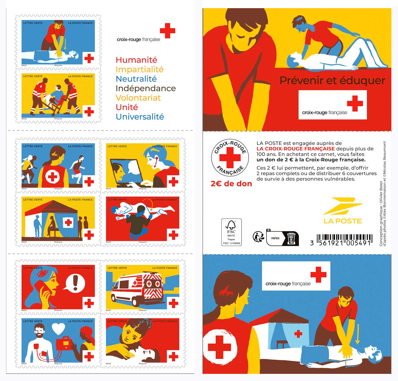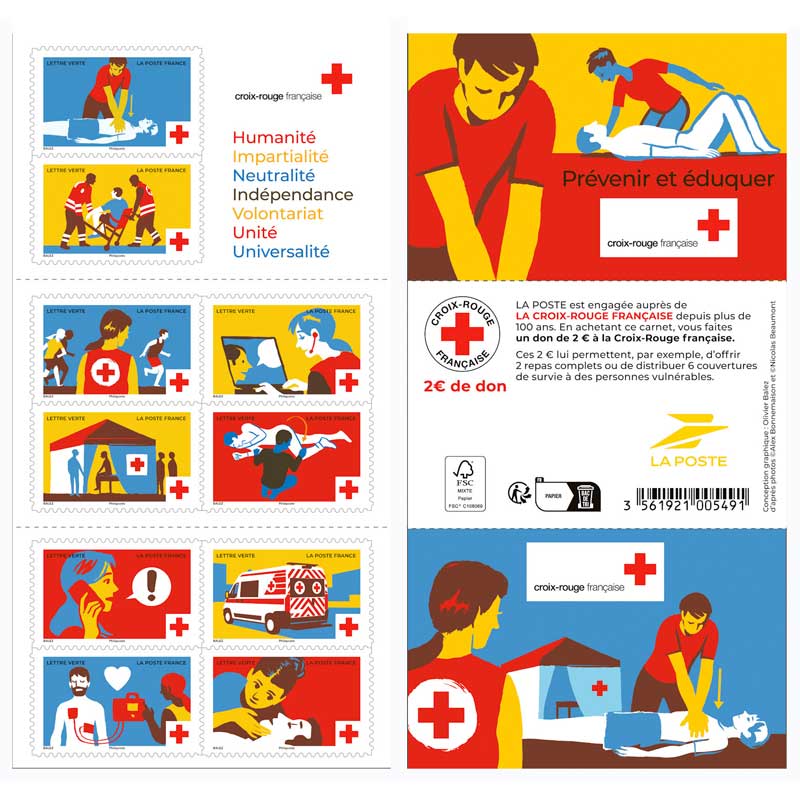 | Commentaire | Ce carnet est grevé d'une surtaxe de 2,00 € de don à la Croix-Rouge. Visuels : les gestes de premier secours et l'intervention des personnels bénévoles de la CRF pour sauver la vie des victimes. Aide apportée : La Croix-Rouge et le Groupe La Poste travaillent ensemble à la création de produits philatéliques depuis 1914. |