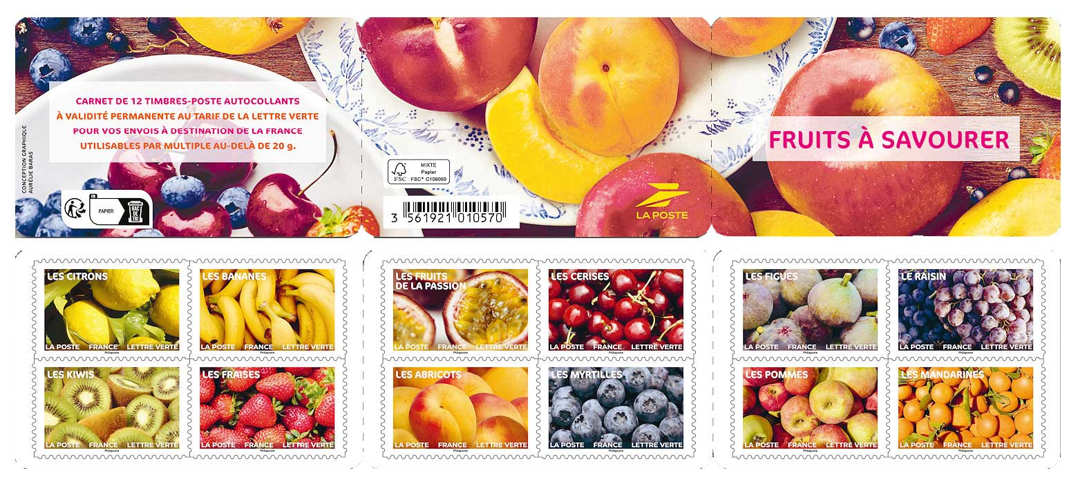 | Description | Émission d'un carnet de 12 timbres-poste illustré par des photographies de fruits à savourer sans modération. |
