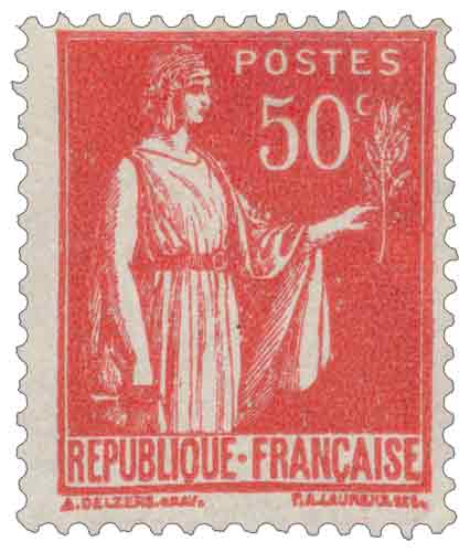 | Commentaire | Paix de Laurens. Type I. Émis dès septembre 1932, le 50 c rose-rouge est la première valeur réellement diffusée de la série Paix. Elle ouvre la transition tarifaire de l’automne 1932 et remplace progressivement certaines Semeuses de petit format. L’impression typographique réalisée par Delzers présente très souvent un encrage irrégulier dans les aplats roses, rendant cette valeur intéressante pour les études de constances. Ce timbre occupe une place centrale dans les affranchissements simples de la période 1932-1934 (notamment les imprimés et cartes postales). Sa nuance rose-rouge, parfois plus « carminée » sur les premiers tirages, fait l’objet de distinctions chez plusieurs marchands spécialisés, bien qu’aucune n’ait valeur de type officiel.