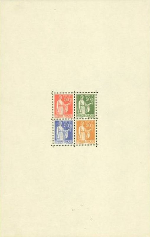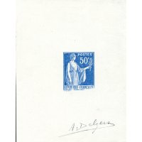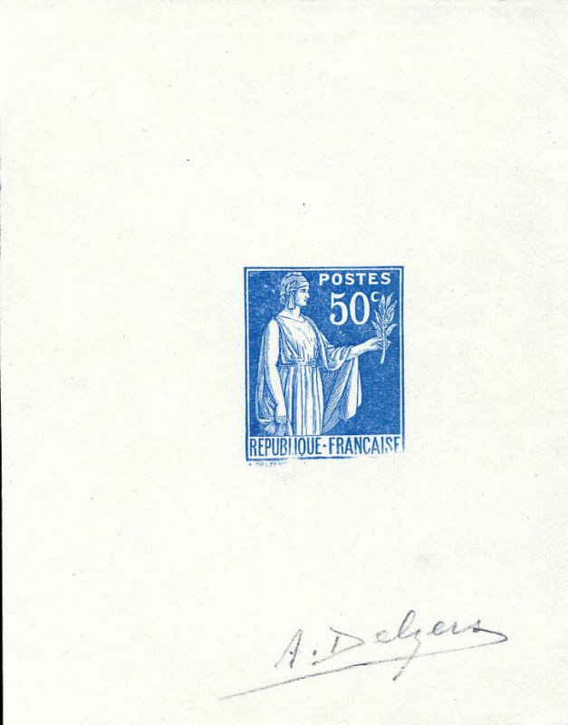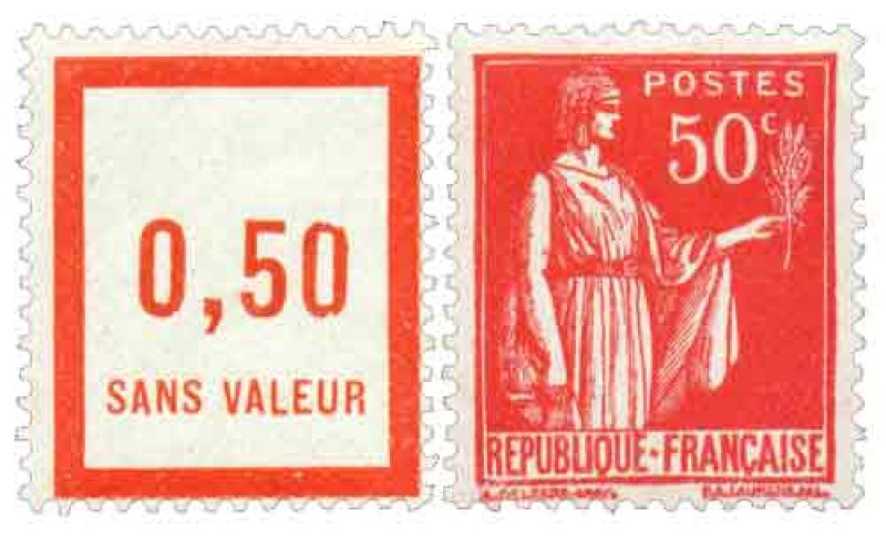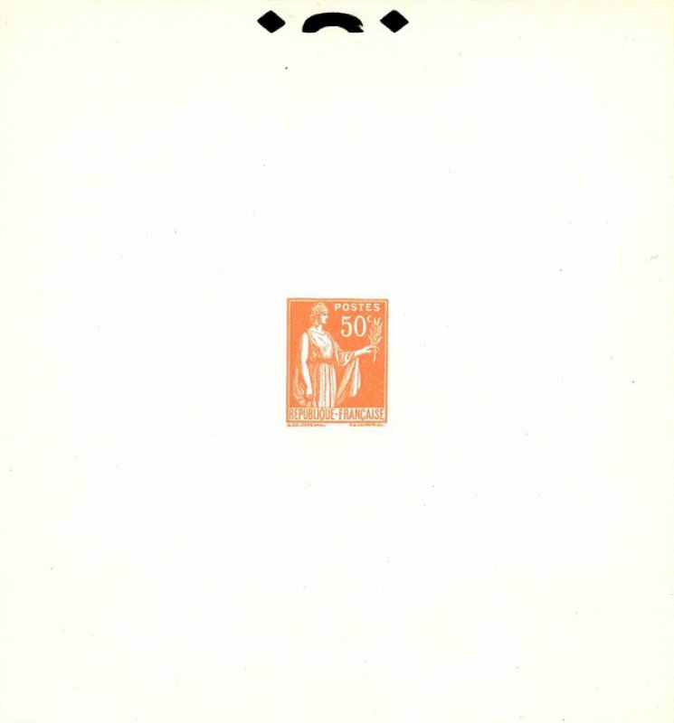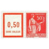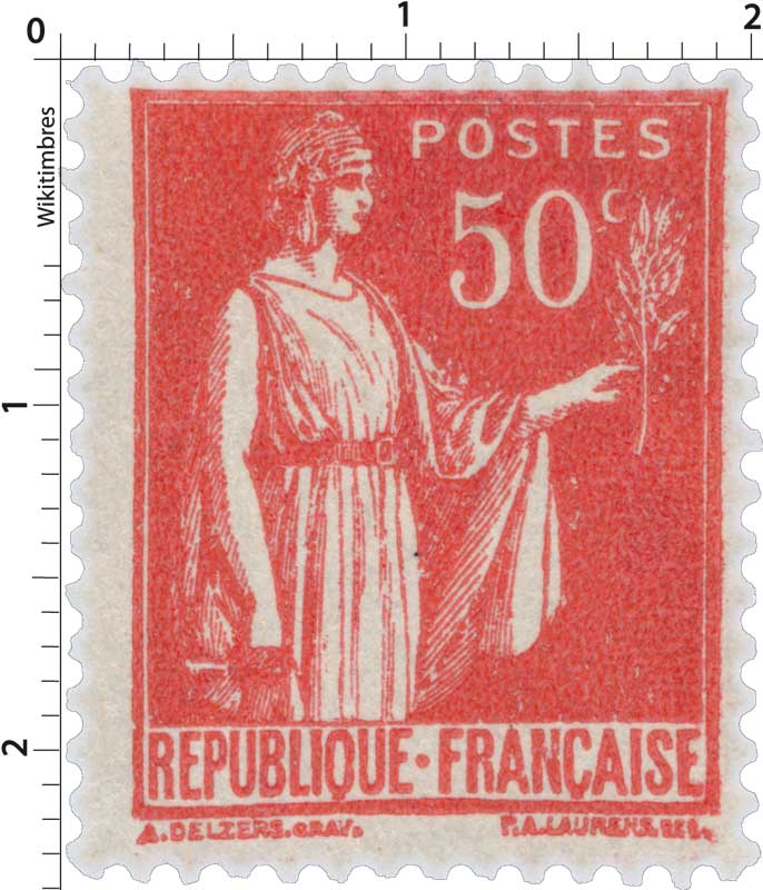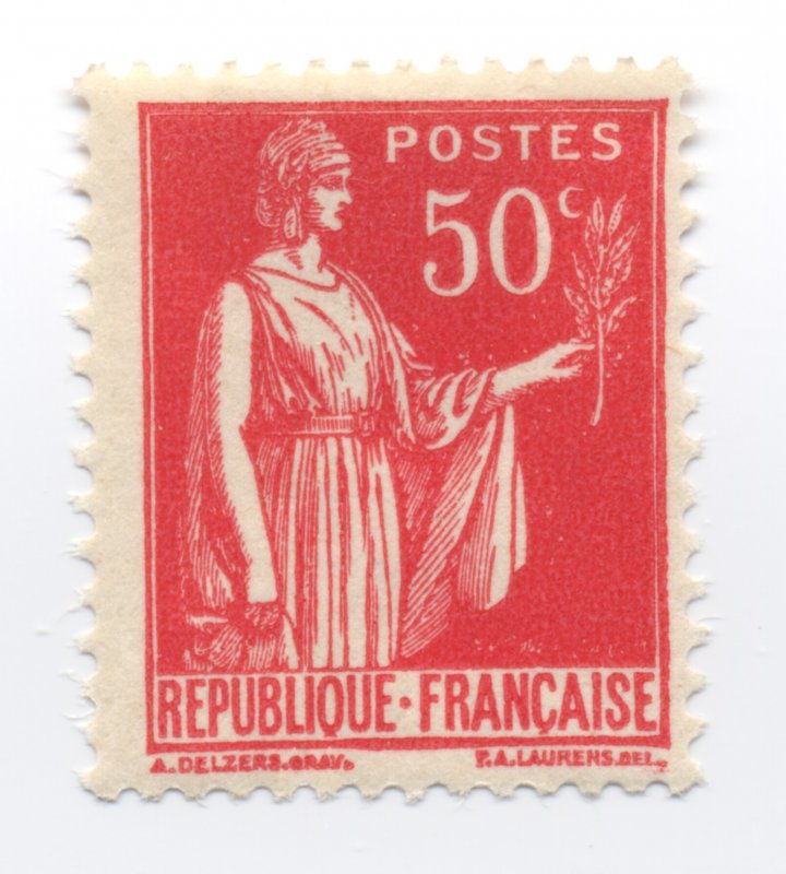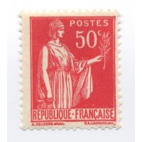 | Commentaire | Paix de Laurens. Type I. Émis dès septembre 1932, le 50 c rose-rouge est la première valeur réellement diffusée de la série Paix. Elle ouvre la transition tarifaire de l’automne 1932 et remplace progressivement certaines Semeuses de petit format. L’impression typographique réalisée par Delzers présente très souvent un encrage irrégulier dans les aplats roses, rendant cette valeur intéressante pour les études de constances. Ce timbre occupe une place centrale dans les affranchissements simples de la période 1932-1934 (notamment les imprimés et cartes postales). Sa nuance rose-rouge, parfois plus « carminée » sur les premiers tirages, fait l’objet de distinctions chez plusieurs marchands spécialisés, bien qu’aucune n’ait valeur de type officiel.