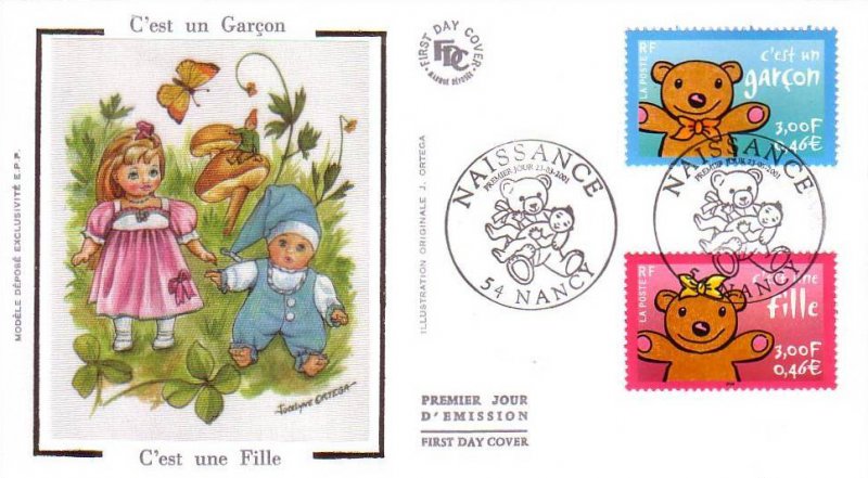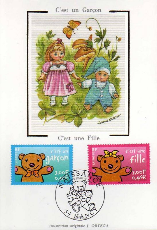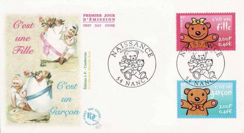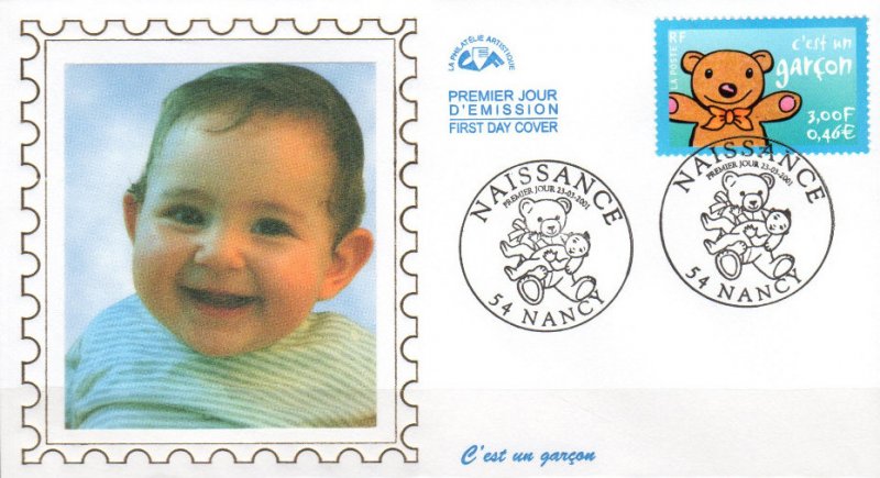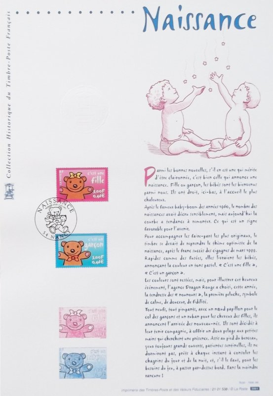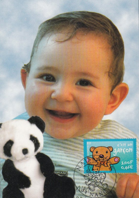 | Commentaire | Description synthétique du visuel du timbre : En rupture par rapport aux timbres émis en 1999 (cigogne sur fond au ton pastel), ce timbre offre un style très différent, plus coloré, plus gai et plus animé. Le jouet fétiche de générations entières de bébés, un ours en peluche, paré d’un nœud papillon, illustre le visuel. Un visuel quasi similaire, décliné en rose, illustre le timbre c’est un fille. Timbre sans millésime |
