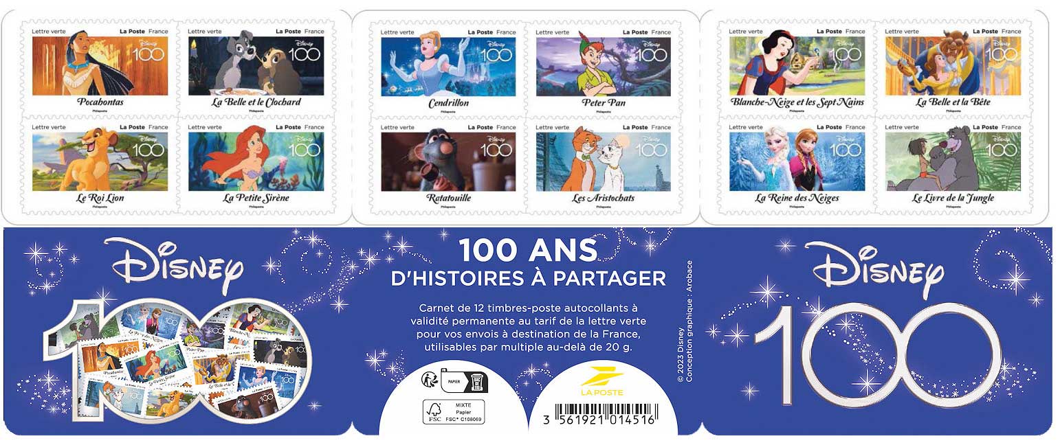 | Description | Émission d'un carnet de 12 timbres-poste à l’occasion du 100ème anniversaire de The Walt Disney Company illustré par 12 personnages emblématiques. |