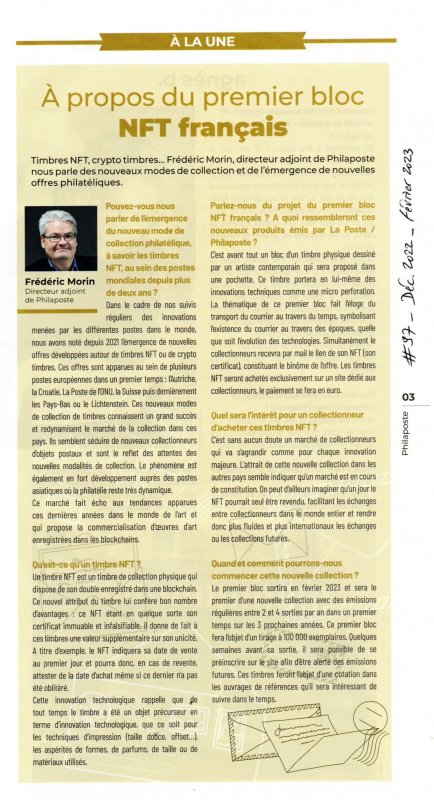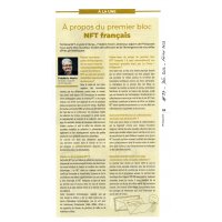 | Commentaire | Présentation : bloc de 1 timbre inséré dans une pochette et mis sous film pour préserver son intégrité. Il proposera également une innovation par la présence d’une micro-perforation reprenant le sigle NFT. |