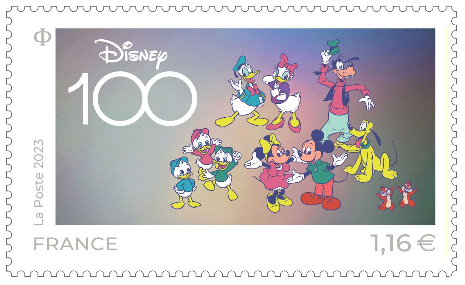 | Commentaire | Visuel : les premiers personnages de l'univers Disney : Mickey et Minnie Mouse (1928, souris anthropomorphes, ambassadeurs de la Walt Disney Company) + Donald et Daisy Duck (1934 et 1940, canards anthropomorphes) + Riri, Fifi et Loulou Duck (Huey, Dewey & Louie Duck, dit les Castors Juniors - 1937, canards anthropomorphes) + Super Dingo (ou Goofy Goof - 1932, chien anthropomorphe) l'un des meilleurs amis de Mickey + Pluto (1930, le chien ) et Tic & Tac (1943/46, tamias (ou chipmunk), petits mammifères rongeurs de la famille des écureuils anthropomorphes). Technique : l’impression offset du timbre se superpose à l’encre argentée de fond pour créer un effet métal tramé innovant |