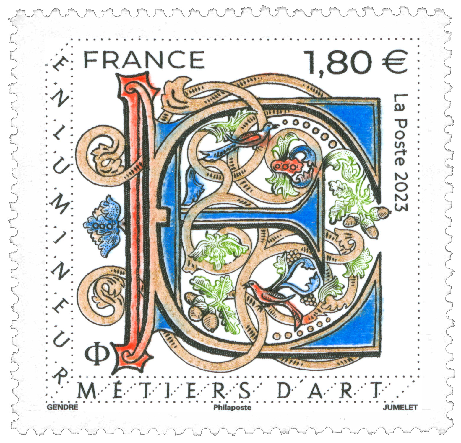 | Description | Emission d'un nouveau timbre dans la série Métiers d’Art initiée en 2016. Après le sculpteur sur pierre, le joaillier, le ferronnier, l’ébéniste, le maroquinier, le tailleur de cristal, le relieur, le facteur d’orgues, le graveur sur métal, le céramiste le vitrailliste, le plumassier, le luthier, le dinandier, l’éventailliste c’est le savoir-faire de l’enlumineur qui est à l’honneur. |
