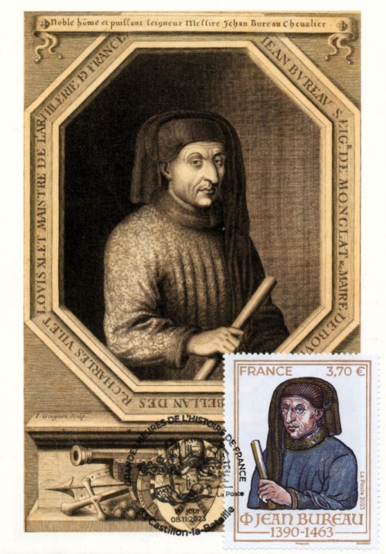 | Commentaire | Jean Bureau, né à Semoine (10-Aube) vers 1390 et décède le 5 juillet 1463 à Paris. Après ses études, il officie à Paris comme avocat. En 1434, il quitte la capitale et se met au service du roi Charles VII. Celui-ci le fait grand-maître de l’artillerie de France, après qu’il se fut distingué au siège de Meaux en 1439. Il sert encore aux sièges de Pontoise et de Harfleur, assiste à la prise de Bayeux et s’emploie à la capitulation de Caen. Il se signale encore devant Bergerac et, après avoir contribué à la reddition des châteaux de Montguyon et de Blaye, assiège Libourne qu’il emporte. Nommé collecteur des impôts de Paris, il devient trésorier général de France en 1443 et est fait chevalier par Louis XI à l’occasion de son sacre en 1461. Selon ses écrits, Bureau était un perfectionniste méthodique, doté d’esprit mathématique ; c’était aussi un brillant administrateur, doué d’une vive imagination. Les frères Bureau, en utilisant massivement l’artillerie (une première en Occident), permettra la victoire contre les Anglais à la bataille de Castillon, mettant ainsi un terme à la Guerre de Cent Ans. Gaspard Bureau participera aux divers sièges et deviendra chevalier en 1464. En savoir plus sur Wikipédia : Bataille de Castillon |