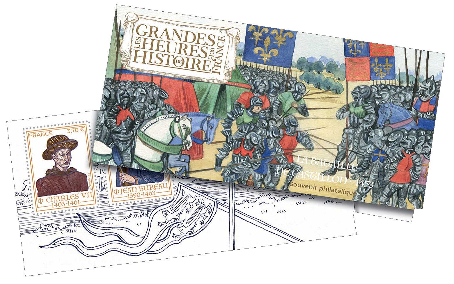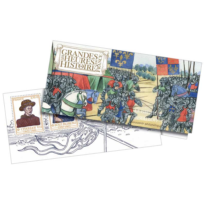 | Description | Émission d'un bloc souvenir sur les Grandes Heures de l’Histoire de France, initiée en 2012, sur la bataille de Castillon, victoire décisive pour les Français, qui marque la fin de la Guerre de Cent ans. Le roi Charles VII et le grand maître d'artillerie Jean Bureau en sont les figures emblématiques. |