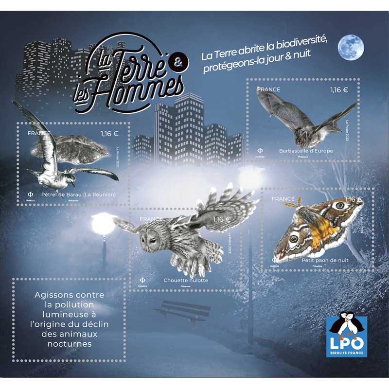 | Description | Émission d'un bloc de quatre timbres en collaboration avec la LPO afin d’alerter sur les conséquences de la pollution lumineuse pour la biodiversité nocturne. |